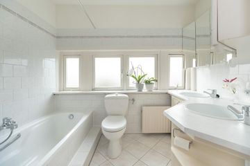 Overloop, twee royale slaapkamers, badkamer met ligbad/douchecombinatie, tweede toilet, vloerverwarming en dubbel wastafelmeubel. Kast met opstelling c.v. (Remeha HR 2011).