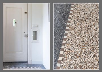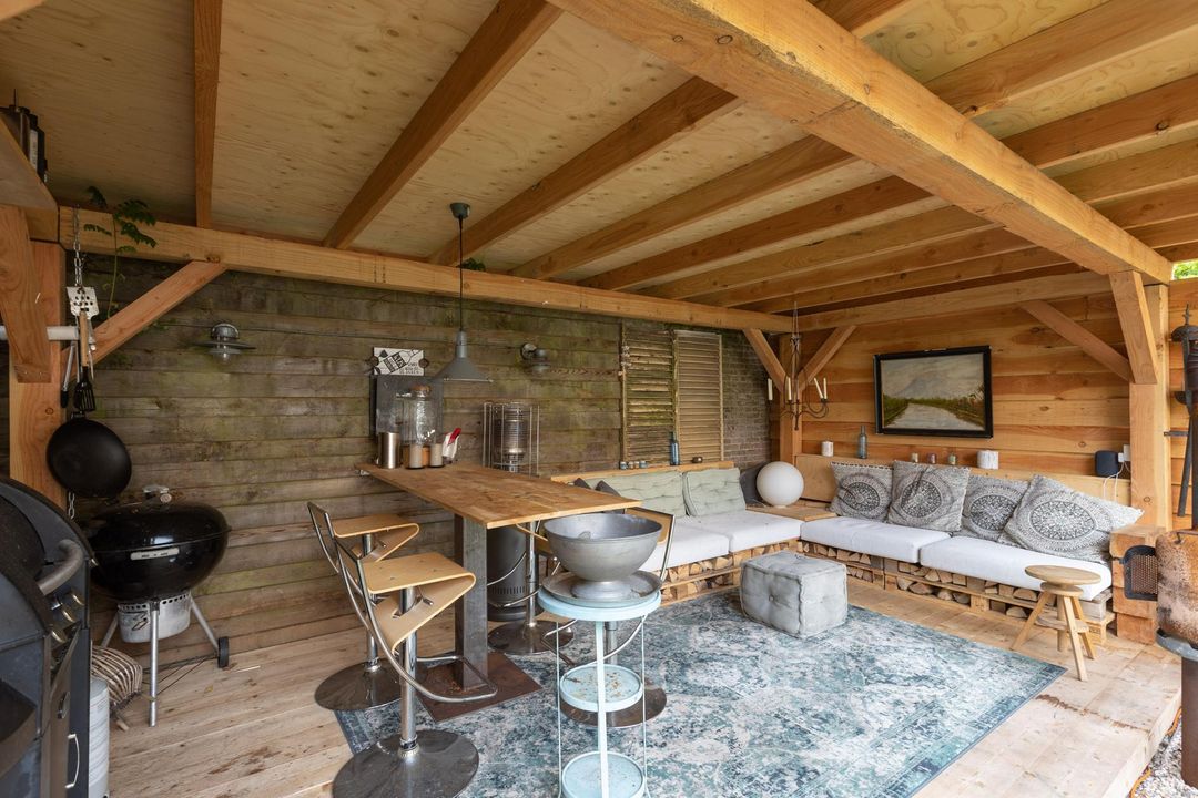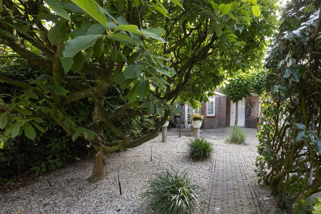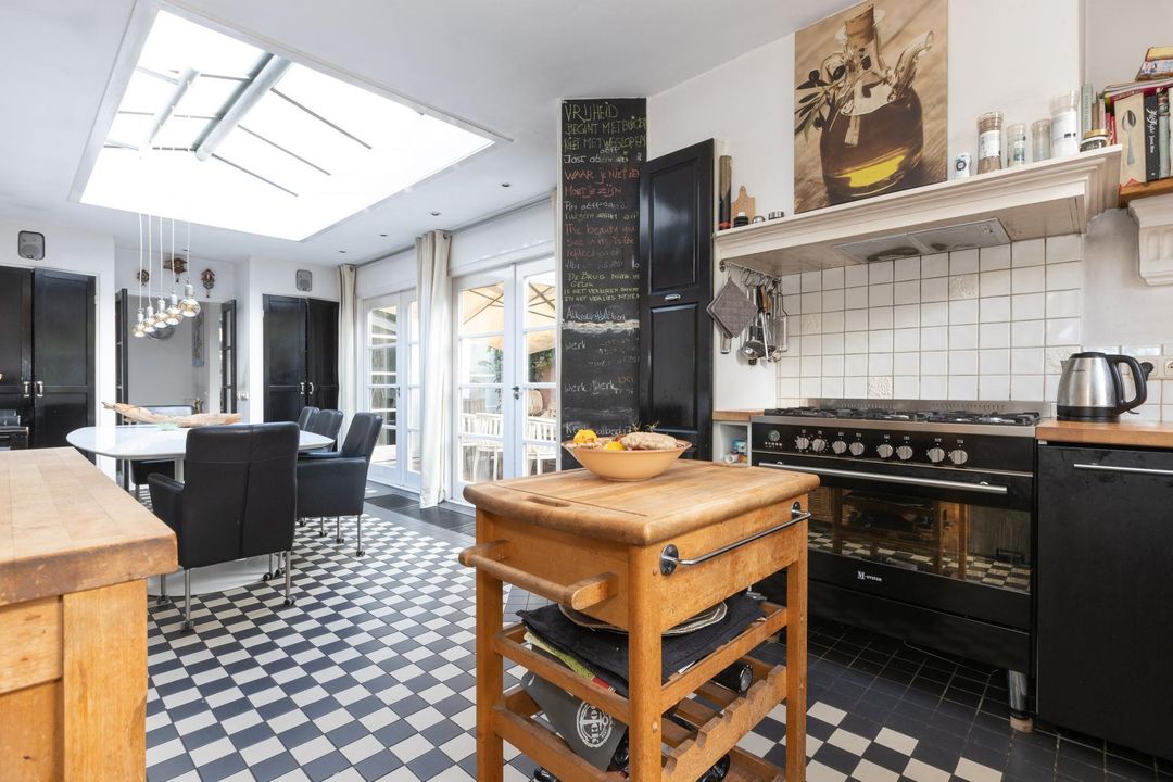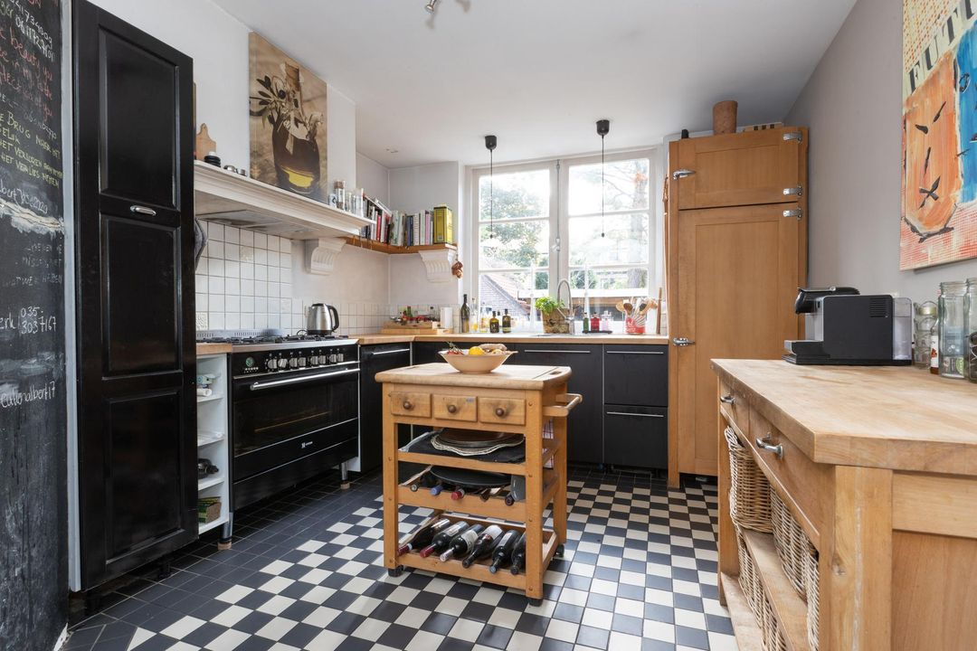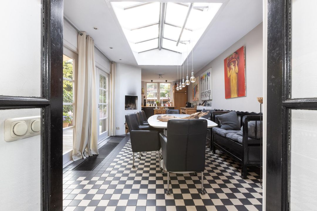 Entree met vestibule, hal met granieten vloer, toegang tot de stahoge kelder, toilet met fontein, lichte royale woonkamer met open haard en openslaande deuren naar de tuin, zij-entree met hal en bergkast met garderobe, woonkeuken met open haard en dubbele opslaande deuren naar terras en tuin.